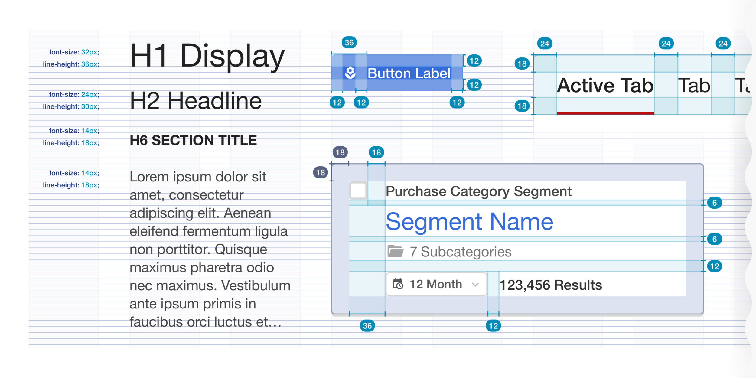 For visual rhythm, the spacing system is based on a 6pt grid, which applies to line heights as well as component padding and margins.